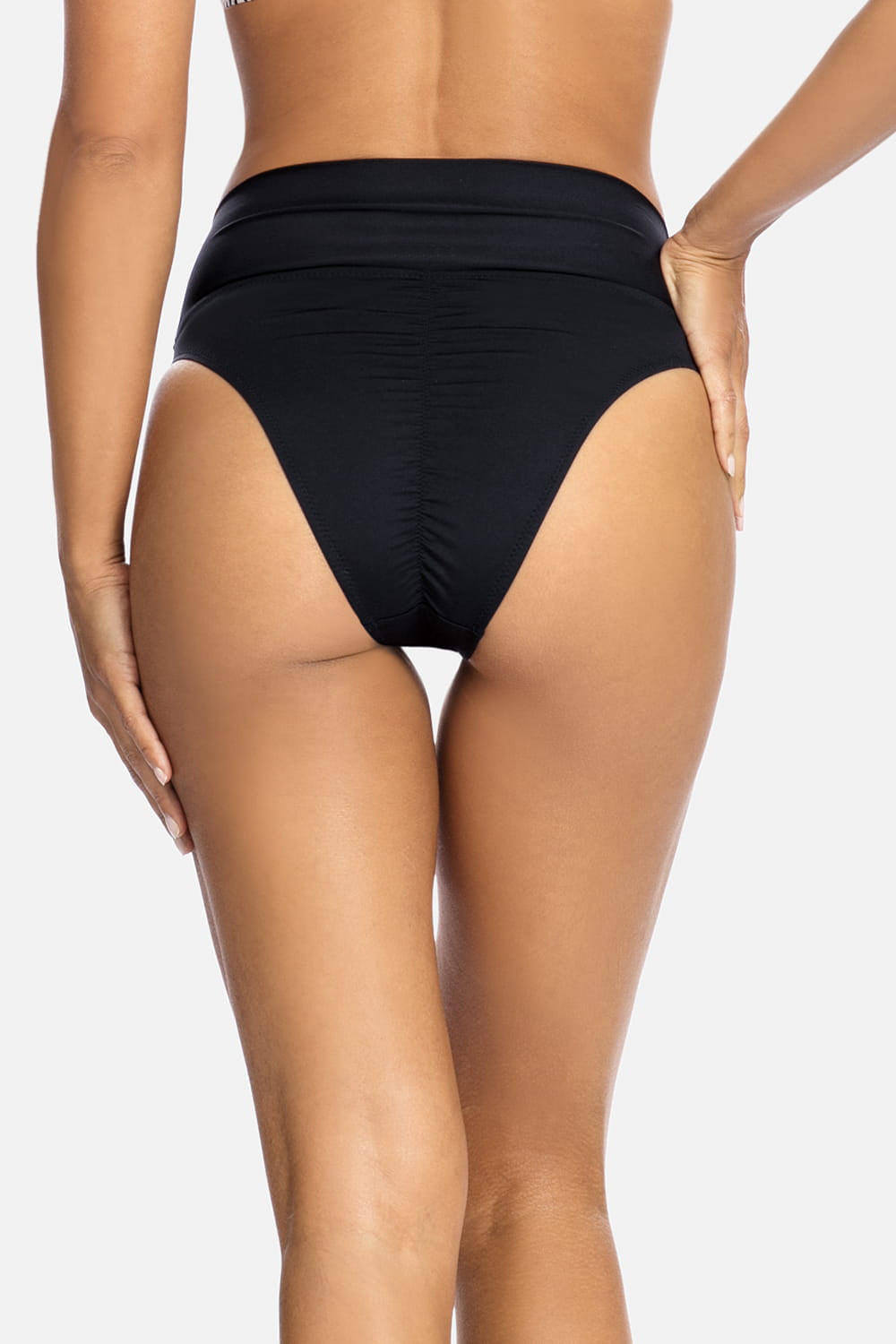 High-waisted bikini bottom. Focus on shaping and comfort! The? high-waisted bikini bottom will sculpt the abdomen area and visually conceal figure imperfections. The back is slightly cut out with an intriguing vertical gathering in the center, accentuating and enhancing the shape of the buttocks (push-up effect). The modern cut of high-waisted bikini bottom is one of the trendiest this season. Bikinis with a high waist are a stylish proposition for women with various body shapes, both slender and curvier. These swim bottoms not only look great but also serve many practical functions: they streamline critical body parts and cover up what you want to mask, emphasize the waist, flatten the stomach, and optically elongate the legs.