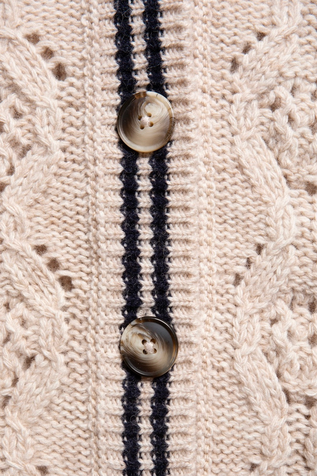 Der Halsausschnitt und die gekn pfte Vorderseite sind mit einem gestreiften 1×1-Rippstrick versehen